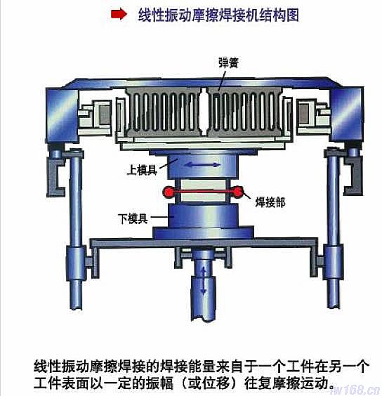 振动摩擦焊接是基于摩擦焊的原理。被压紧在一起的两个塑焊件,振动其中的一个,使其相对另一个做往复位移,位移值最大可达1.8mm 或4mm,该峰值与峰值间的距离称为振幅,而振动的频率为100Hz 或240Hz ,从而产生摩擦热。这就像两只手放在一起摩擦一样。